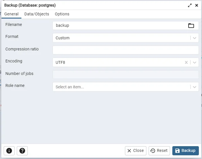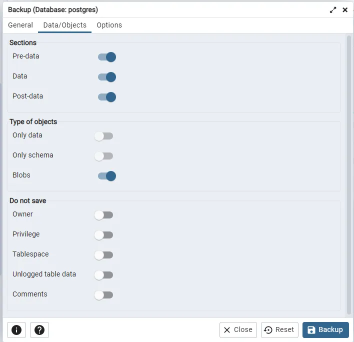- PostgreSQL은 백업 파일에 기존 데이터베이스 소유자(예: postgres) 정보를 포함시키므로, 복원 서버에 해당 ROLE이 없으면 실패할 수 있다. 사전에 동일한 ROLE 생성하거나, 복원 시 Restore Options > Pre-data 탭에서 No owner 체크박스를 선택해야 한다.