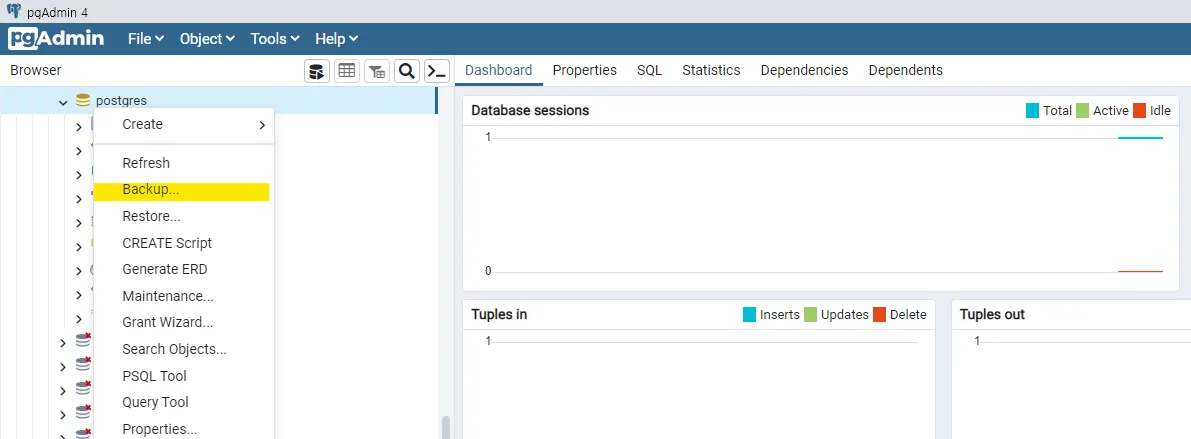 pgAdmin 실행 후 왼쪽 트리에서 백업 대상 DB를 우클릭 → Backup... 클릭