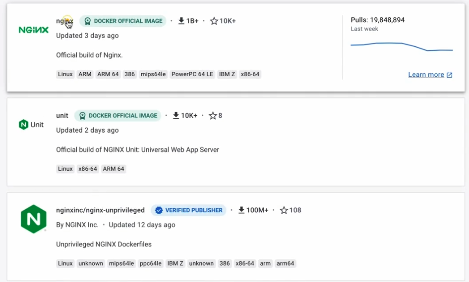 - 먼저 로컬 스토리지에 이미지가 있는지 확인해서 그걸 불러오고, 없으면 도커허브 같은 곳에서 찾는다