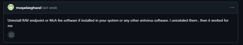 뭐가 문제일까 해당 에러를 깃헙에서 찾아보다가, 관련 이슈를 확인하였다. 보안 프로그램의 실시간 보호 기능이 원인일 수 있다는 정보를 확인할 수 있었다. 회사 컴퓨터라 V3 백신 프로그램을 끌 수는 없어서, '제품 다시 시작 기능'을 통해서 잠깐 꺼졌다가 다시 켜지는 틈을 타서 빌드를 실행하니 문제가 해결되었다. ㅎ