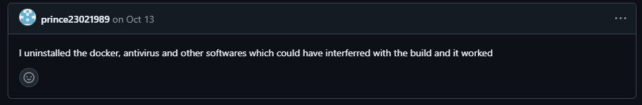 뭐가 문제일까 해당 에러를 깃헙에서 찾아보다가, 관련 이슈를 확인하였다. 보안 프로그램의 실시간 보호 기능이 원인일 수 있다는 정보를 확인할 수 있었다. 회사 컴퓨터라 V3 백신 프로그램을 끌 수는 없어서, '제품 다시 시작 기능'을 통해서 잠깐 꺼졌다가 다시 켜지는 틈을 타서 빌드를 실행하니 문제가 해결되었다. ㅎ